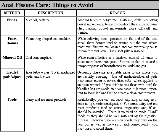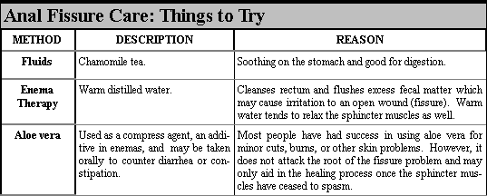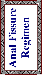 Over the last two years I have had to intermittently deal with a chronic, acute anal fissure.  After spending a lot of time investigating and experimenting with various cures, I have come to understand what works best for me.  The purpose of the following regimen is to share my insight with others who suffer with an anal fissure.  As a precautionary note, the regimen is by no means complete and any treatment should first be coordinated with a licensed  physician.  Good luck!